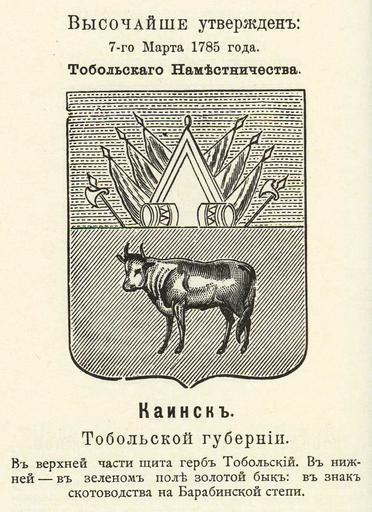 | Keywords: Каинск 1785 из Винклера.jpg Official Russian Empire Kainsk coat of arms Ге б го ода Каинск Тобольской губе нии Российской Импе ии с официальным описанием в Ге бовнике Павла Пет овича Винкле а П П фон-Винкле Ге бы го одов губе ний областей и посадов Российской Импе ии внесенные в Полное Соб ание законов с 1649 по 1900 год Дозволено цензу ою С -Пете бу г 20 Июля 1899 года Издание книгото говца Ив Ив Иванова С -Пете бу г Типог афия И Комелова П яжка д 3 1899 / Scanned 1785 / 1899 published П П фон Винкле / Pavel von Vinkler PD-old PD-RusEmpire PD-RU-exempt coats of arms Gerbovnik Vinklera - City CoAs Coats of arms of Tobolsk Governorate Buffalo in heraldry |