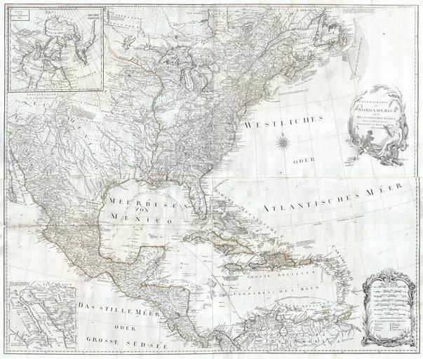 | Keywords: 1788 Schraembl - Pownall Map of North America ^ the West Indies - Geographicus - NorthAmerica2-schraembl-1788.jpg A rare and extraordinary post-colonial wall map of North America by Vienna map publisher Franz Anton Schraembal Printed in 1788 for inclusion in Schraembal ™s Allgemeiner Grosser Atlas this is one of the first maps issued to depict North America following the American Revolutionary War While this map has been updated to reflect the surveys prepared under Massachusetts governor Thomas Pownall it is heavily based upon the important 1783 map of North America issued by Sayer and Bennet The whole is beautifully rendered with wonderful detail regarding the early states roads canals the Great Lakes American Indian Nations and explorer ™s observations Vermont is not present on the map Most of the southern states are without western boundaries but seem to extend only to the Appellation Mountain range In the upper left quadrant there is an inset of the Baffin and Hudson Bay region including some references to the explorations of Admiral De Fonte in search of a Northwest Passage as well as to the indigenous Eskimo tribes Another inset in the lower left quadrant shows the parts of California which Father Franz Kino walked between 1698 and 1701 Kino headed the historic expedition which proved California to be attached to the North American mainland and ultimately defeated the California as an Island theory Upper right quadrant features an elaborate title cartouche depicting a stylized American Indian woman and cherubs wrestling fish from the sea A second cartouche in the lower right quadrant features a key to the map A altogether magnificent map offering both stunning beauty and historic value 1788 dated Size in 45 25 39 object history credit line accession number NorthAmerica2-schraembl-1788 Schraembal F A <i>Allgemeiner Grosser Atlas</i> 1788 edition Geographicus-source PD-Art-100 1788 maps Old maps of North America Old maps of Central America Old maps of the Caribbean Maps by Franz Anton Schraembl Caribbean in the 1780s North America in the 1780s Maps of Baffin Bay Hudson Bay Maps in German Gulf of California |