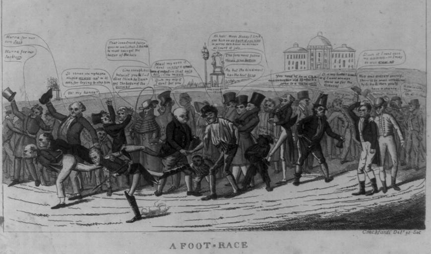 | Keywords: 1824 Footrace byDClaypooleJohnston LibraryOfCongress.jpg A foot-race 1824 By D C Johnston A figurative portrayal of the presidential race of 1824 A crowd of cheering citizens watch as candidates left to right John Quincy Adams William Crawford and Andrew Jackson stride toward the finish Henry Clay has dropped from the race and stands hand on head on the far right saying D--n it I cant save my distance--so I may as well draw up He is consoled by a man in riding clothes Well dont distress yourself--there'll be some scrubbing by by then you'll have a chance Assorted comments come from the crowd reflecting various sectional and partisan views A Westerner with stovepipe hat and powder horn Hurra for our Jacks- son Former President John Adams Hurra for our son Jack Two men in coachmen's livery That inne-track fellow Crawford goes so well; that I think he must have got the better of the bots boss and Like enough; but betwixt you I--I dont think he'll ever get the better of the Quinsy A ragged Irishman Blast my eyes if I dont venter a small horn of rotgut on that bald filly in the middle Adams A Frenchman Ah hah Mon's Neddy I tink dat kick on de back of you side is worse den have no dinner de fourt of july In the left background is a platform and an inaugural scene the Presidential Chair with a purse 1824 engraving by David Claypoole Johnston via Library of Congress Prints and Photographs Division Washington D C 20540 USA http //hdl loc gov/loc pnp/pp print at http //www loc gov/item/2008661728/ 1824 creator David Claypoole Johnston 1824 cartoons Caricatures of Andrew Jackson Caricatures of John Quincy Adams David Claypoole Johnston William Crawford Caricatures of Henry Clay United States presidential election 1824 PD-old-100 |