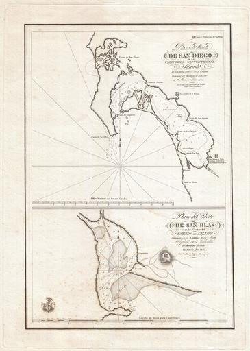 | Keywords: 1825 Victoria Map of San Diego, California and San Blas, Mexico - Geographicus - SanDiego-victoria-1825.jpg This is an exceptionally rare and early map of San Diego Bay California and San Blas Mexico published in 1825 by order of Senor Don Guadalupe Victoria the first president of the Republic of Mexico Essentially two maps on a single sheet this map highlights the starting point San Blas an ending point San Diego of the Spanish supply route to southern California The upper map focuses on San Diego Bay covering the region from Puerto Falso Mission Harbor to Punta de Arena The fortress of San Diego the Presidio the Ranchera de Choyas the Poblacion of San Diego Mission of San Diego and a ranch and Indian village in the southwestern part of the bay among other sites are all noted The lower map focusing on San Blas details the Bay from the Rio de Santiago to the village of San Blas today a small fishing village near Puerto Vallarta Both maps offer numerous depth soundings references to shoals reefs and other undersea dangers and notes on anchorage The armorial crest of Mexico appears in the lower left quadrant Though ostensibly similar to the map of the same regions published by Perouse in his 1797 atlas this is in truth a different map with the apparent similarity stemming from the fact that both maps are drawn from the same source “ the pioneering cartography of Juan Pantoja y Arrianga Pantoja was the navigator and cartographer of the Frigate Princesa which was commissioned in 1782 to supply Spain ™s few colonial outposts along the remote California coastline The Princesa sailed from the harbor of San Blas to San Diego where during a seven week break Pantoja produced the first accurate survey of San Diego Bay Pantoja ™s work remained in manuscript form until 1802 when it was published to illustrated Espinosa and Tello's Relacion Del Viage Hecho Por Las Goletas Sutil Y Mexicana En El Ano De 1792 Around this time the Spanish government looking to firm its holdings on the California coast commissioned a series of nautical charts based on Pantoja ™s work The 1810 El Grito which set off the Mexican Independence movement halted most Spanish financed map publication work in the Americas It was left to Mexico ™s first president Senor Don Guadalupe Victoria to resurrect Spain ™s abandoned cartographic effort and finally publish this important map series The Los Angeles Bookseller Jake Zeitlin claimed that this map was published in London by John Arrowsmith While Arrowsmith ™s name does not appear on the work the quality of the paper and the exceptionally fine engraving is definitely suggestive of a well-established European publishing house No similar work of this quality is evident from either Mexican or American publishers of the period This map is extremely scarce and we know of only four other examples in institutional collections the Bancroft Library The Huntington Library the University of Arizona and the U C San Diego Campus Library 1825 dated Size in 15 21 object history credit line accession number SanDiego-victoria-1825 Geographicus-source PD-Art-100 1825 in Mexico San Diego Bay San Blas Nayarit Maps in Spanish 1825 maps Old maps of Mexico |