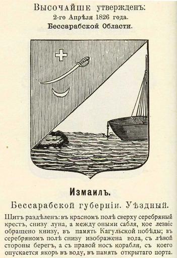 Keywords: Измаил 1826 из Винклера.jpg Official Russian Empire Izmail coat of arms Ге б уездного го ода Измаил Бесса абской губе нии Российской Импе ии с официальным описанием в Ге бовнике Павла Пет овича Винкле а П П фон-Винкле Ге бы го одов губе ний областей и посадов Российской Импе ии внесенные в Полное Соб ание законов с 1649 по 1900 год Дозволено цензу ою С -Пете бу г 20 Июля 1899 года Издание книгото говца Ив Ив Иванова С -Пете бу г Типог афия И Комелова П яжка д 3 1899 / Scanned 1826 / 1899 published П П фон Винкле / Pavel von Vinkler PD-old PD-RusEmpire PD-RU-exempt coats of arms Gerbovnik Vinklera - City CoAs Coats of arms of Bessarabia Governorate Sabres in heraldry Crosses in heraldry 1 crescent argent in heraldry Water in heraldry Boats in heraldry Coats of arms of Izmail History of Izmail Historical coats of arms of Odessa Oblast