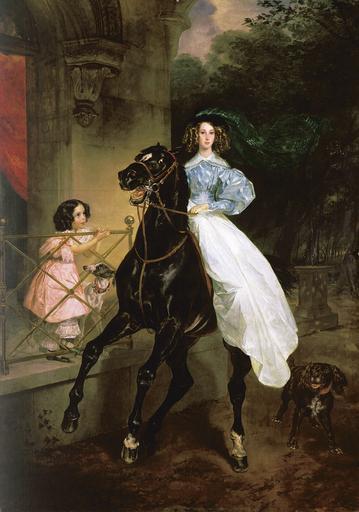 | Keywords: 1832. BRULLOV VSADNICA1.jpg Artwork ru Всадница По т ет Джованины и Амацилии Пачини воспитанниц г афини Ю П Самойловой 1832 Холст масло 291 5 x 206 см Госуда ственная Т етьяковская гале ея осква Россия en Horsewoman Portrait of Giovannina and Amacilia Pacini the Foster Children of Countess Yu P Samoilova 1832 Oil on canvas cm 291 5 206 Institution Tretyakov Gallery 9 Natural daughters of composer Giovanni Pacini Catania 1796 Pescia 1867 and Adelaide Castelli Naples - Naples 1828 ; Giovannina Pacini Naples 1825 - and Amacilia Pacini Naples 1827 - http //lj rossia org/users/john_petrov/435960 html here / здесь other versions <gallery>Karl Bryullov Bryullo - Всадница - Google Art Project jpg</gallery> PD-old-100 DEFAULTSORT 1832; Giovannina Amacilia Pacini Art works uploaded by Andrew Butko from various sources 1000-1999 px on long side Collective portraits by Karl Briullov Female portraits by Karl Briullov 19th-century portraits in the Tretyakov Gallery Yuliya Samoylova Pahlen 1830s portrait paintings 1832 paintings from Russia 19th-century oil equestrian portraits of women Riding habit in portrait paintings 19th-century oil portraits of girls at full length 19th-century portrait paintings with dogs Black horses in art Portrait paintings of girls from Russia Children of Naples Women of Naples Equestrian portraits by Karl Brullov |