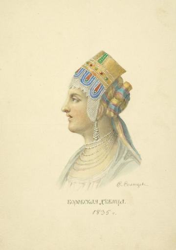 | Keywords: Солнцев Боровская девица 1835 a.jpg ru Бо овская девица Ф Г Солнцев «Одежды Русского госуда ства» 1835 https //vk com/album-43310606_170289551 Creator Fedor Solntsev other versions Custom license marker 2015 02 08 PD-old-100 Uploaded with UploadWizard Clothes Of Russian Country - Folk clothing Russian costumes of Kaluga Governorate Venets headgear |