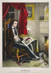 Keywords: 1846-single-bachelor-solitude.jpg Single an 1846 engraved print showing a man sitting by the fire in his solitary abode and lamenting his bachelorhood His boots lie on the floor; presumably he has had to take them off himself A broken tobacco-pipe is also on the floor He holds in his hand another print titled Married showing a man with wife and three children Artists' signature at lower right Anderson Honeydew New-York Edited from file http //memory loc gov/master/pnp/cph/3g00000/3g06000/3g06000/3g06020u tif at the Library of Congress website ---- Bibliographic information found at LoC site TITLE Single / Kelloggs Thayer N Y ; E B E C Kellogg Hartford Conn ; D Needham Buffalo CALL NUMBER PGA - Kellogg--Single A size A size P P REPRODUCTION NUMBER LC-USZC4-6020 color film copy transparency LC-USZ62-84993 b w film copy neg SUMMARY Man seated in chair looking at picture of a family MEDIUM 1 print lithograph color CREATED/PUBLISHED c1846 CREATOR E B E C Kellogg Firm NOTES Copyright by Kelloggs Thayer SUBJECTS Bachelors--1840-1850 Families--1840-1850 FORMAT Lithographs Color 1840-1850 REPOSITORY Library of Congress Prints and Photographs Division Washington D C 20540 USA DIGITAL ID color film copy transparency cph 3g06020 http //hdl loc gov/loc pnp/cph 3g06020 b w film copy neg cph 3b31536 http //hdl loc gov/loc pnp/cph 3b31536 CARD 98516913 Edited from file http //memory loc gov/master/pnp/cph/3g00000/3g06000/3g06000/3g06020u tif 1846 Anderson Honeydew New-York PD-old-70-1923 1840s fashion Marriage Young men in art 1846 1846 Chromolithographs Paintings in art Sitting_men Sitting with legs crossed ankle-on-ankle Grief in art