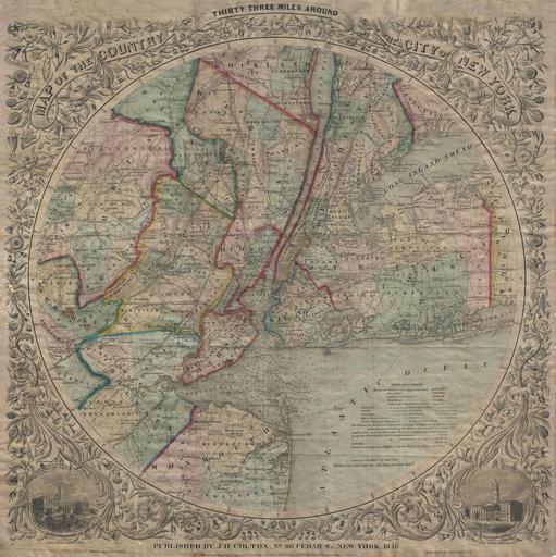 Keywords: 1848 Colton Map of New York City and Vicinity (33 Miles Around) - Geographicus - NewYork33Miles-colton-1848.jpg This is the extremely rare 1848 edition of one of the most beautiful pocket maps of New York made in the 19th century Colton ™s Thirty Three Miles Around the City of New York Covers New York City and vicinity as far south as Ocean County New Jersey as far east as Suffolk County as far north as Rockland County and as far west as Somerset County Reveals the area in considerable detail with special attention to settlements tolls roads and railroads New York Bay and Harbor offers numerous depth soundings taken from the 1850 U S Coast Survey chart of the region Surrounded by a splendid decorative border with engraved views depicting City Hall New York and City Hall Brooklyn This map was drawn and engraved by J M Atwood based upon J H Eddy ™s 1811 map of a similar name Colton ™s success with this attractive map was such that it was issued in various editions for over 50 years Haskell notes eight different editions between 1846 and 1873 and Rumsey has a variant dated 1891 Dated 1848 at the base of the map below map proper Below this at the base of the map the copyright reads Entered according to the Act of Congress in the Year of 1846 by J H Colton Co in the Clerk ™s Office of the District Court of the Southern District of New York Published by the Colton firm prior to their 1859 bankruptcy from their 172 William Str Office in New York City 1848 dated Size in 23 23 object history credit line accession number NewYork33Miles-colton-1848 Geographicus-source PD-old-100 Old maps of New York City 1848 maps Maps by Joseph Hutchins Colton Round maps Maps in English |