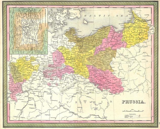 | Keywords: 1850 Mitchell Map of Prussia Germany - Geographicus - Prussia-m-50.jpg This hand colored map is a copper plate engraving dating to 1850 by the legendary American mapmaker S A Mitchell the elder It represents Prussia This map features a detailed inset map of Berlin Most major national and local political distinctions are outlined and defined by vibrant color reds greens yellows browns This map is dated and copyrighted 1850 1850 dated Size in 15 13 object history credit line accession number Prussia-m-50 <i>A New Universal Atlas Containing Maps of the various Empires Kingdoms States and Republics Of The World </i> 1850 issue Geographicus-source PD-old-100 Maps by Samuel Augustus Mitchell Old maps of Prussia 1850 maps Maps in English Old maps of Brandenburg |