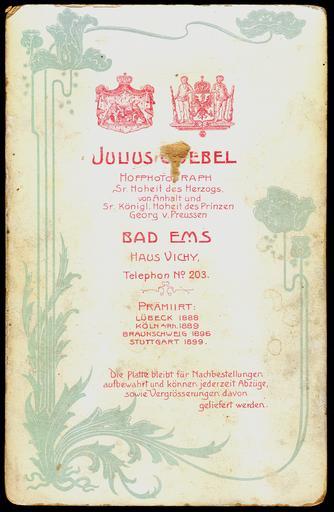 | Keywords: 1850er Album Apothekerfamilie Portwich Hannover Herrenhausen Kirchrode, Paar (Hoffotograf Julius Goebel, Bad Ems), Adressseite.jpg Rückseite Revers der Fotografie im Kabinettformat zwischen Blumen- und Pflanzenornamentik im Jugendstil und unterhalb von zwei Wappen die Angaben Zitat Julius Goebel Hofphotograph Sr Hoheit des Herzogs von Anhalt und seiner Königl Hoheit des Prinzen Georg v Preussen / Bad Ems Haus Vichy Telefon No 203 Zusätzlich ließ der Hoffotograf Ort und Datum seiner Auszeichnungen für seiner Arbeiten mit denen er offensichtlich an Ausstellungen teilgenommen hatte vordrucken Prämiirt Lübeck 1888 / Köln a/Rh 1889 / Braunschweig 1896 / Stuttgart 1899 In der Sprache des 19 Jahrhunderts findet sich auch der geschäftsfördernde Hinweis Die Platte bleibt für Nachbestellungen aufbewahrt und können jederzeit Abzüge sowie Vergrößerungen davon geliefert werden Der Name des Lithografen des Karton-Vordruckes fehlt hier Scan vom Original Bernd Schwabe; mit Dank an die Secondhandler und Kunsthandwerker Elfie Ignaz in der Oberstraße in Hannover ~ 1900 Julius Goebel Julius Goebel Hoffotograf Familie Portwich Hannover PD-old |