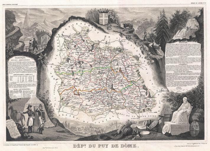 Keywords: 1852 Levasseur Map of the Department Du Puy de Dome, France - Geographicus - PuyDeDome-levasseur-1852.jpg This is a fascinating 1852 map of the French department of Puy De Dome France This mountainous department includes Auvergne one of the leading cheese regions in France Here you can find a wide variety of cheeses from Cantal a pressed cheese to a number of Bleu Cheeses to local specialties such as Savaron and Bleu de Laqueille The region is also known for its spectacular volcanic rock formations The map proper is surrounded by elaborate decorative engravings designed to illustrate both the natural beauty and trade richness of the land There is a short textual history of the regions depicted on both the left and right sides of the map Published by V Levasseur in the 1852 edition of his Atlas National de la France Illustree 1852 undated Size in 17 12 object history credit line accession number PuyDeDome-levasseur-1852 Levassuer V <i>Atlas National Illustre des 86 Departements et des Possessions de La France Divise par Arrondissements Cantons et Communea avec La Trace de Toutes Les Routes Chemins de fer et Canaux </i> 1852 edition Geographicus-source PD-old-100 Victor Levasseur - Maps of France France 1852 maps France Old maps of Puy-de-Dôme |