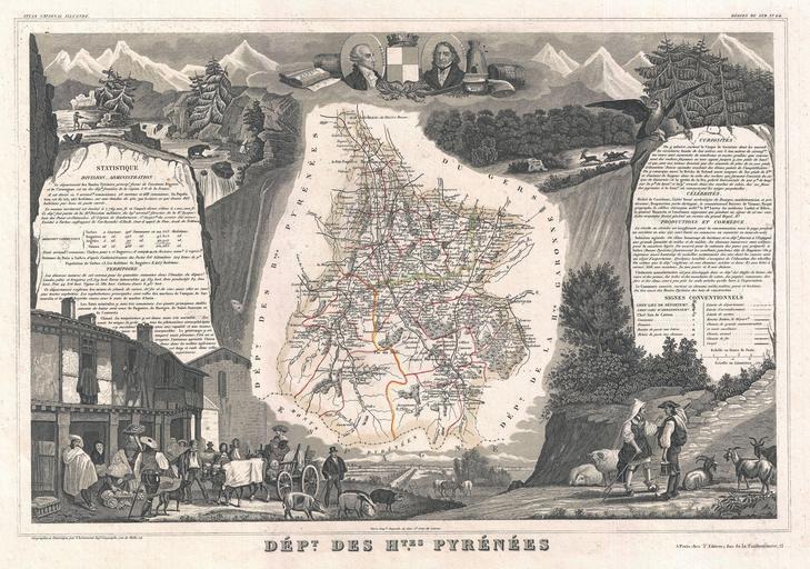 Keywords: 1852 Levasseur Map of the Department Des Hautes Pyrenees, France - Geographicus - HautesPyrenees-levasseur-1852.jpg This is a fascinating 1852 map of the French department of Hautes Pyrenees France This area is home to the wine producing region Madiran Madrian is best known for producing a powerful red wine made from the Tannat grape This area also makes a number of cheeses including Tomme Noire des Pyrenees and Roquefort cheese The map proper is surrounded by elaborate decorative engravings designed to illustrate both the natural beauty and trade richness of the land There is a short textual history of the regions depicted on both the left and right sides of the map Published by V Levasseur in the 1852 edition of his Atlas National de la France Illustree 1852 undated Size in 16 5 11 5 object history credit line accession number HautesPyrenees-levasseur-1852 Levassuer V <i>Atlas National Illustre des 86 Departements et des Possessions de La France Divise par Arrondissements Cantons et Communea avec La Trace de Toutes Les Routes Chemins de fer et Canaux </i> 1852 edition Geographicus-source PD-old-100 Cheese in Hautes-Pyrénées 1852 maps France Old maps of Hautes-Pyrénées Maps in French France Symbols of Tarbes coat of arms Bertrand Barère de Vieuzac Dominique Larrey Victor Levasseur - Maps of France France |