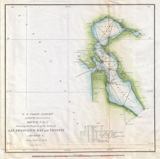| Keywords: 1853 U.S. Coast Survey Map of San Francisco Bay, California - Geographicus - SanFranciscoBayJ2-uscs-1853.jpg An attractive hand colored 1853 U S Coast Survey triangulation chart or map of San Francisco Bay California Shows the progress of the survey work in this area by date annotated sections Shows points such as California City San Quentin San Francisco Presidio Hill and Lime Point Bluff among others Details the grid layout of San Francisco city The hand color work on this beautiful map is exceptionally well done This map was compiled under the direction of A D Bache Superintendent of the Survey of the Coast of the United States and one of the most influential American cartographers of the 19th century 1852 dated Size in 10 5 10 75 object history credit line accession number SanFranciscoBayJ2-uscs-1853 <i>Report of the Superintendant of the U S Coast Survey </i> 1853 edition Geographicus-source PD-art United States Coast Survey maps Old maps of San Francisco Bay 1852 maps |