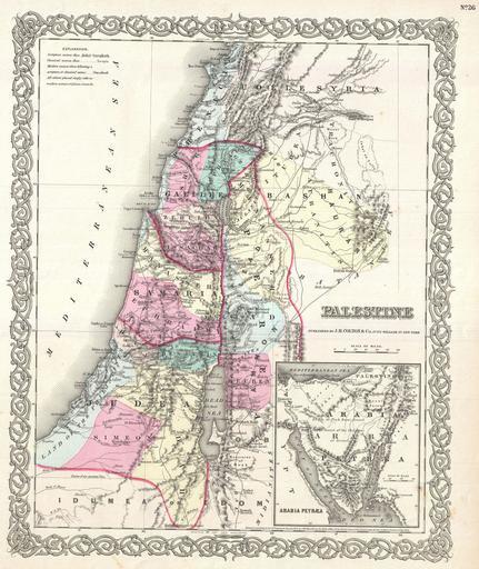 | Keywords: 1855 Colton Map of Israel, Palestine or the Holy Land - Geographicus - PalestineIsrael-colton-1855.jpg A beautiful 1855 first edition example of Colton's map of Palestine Israel or the Holy Land Includes the modern day nations of Israel Palestine and Lebanon with parts of adjacent Syria and Jordan Notes both ancient and contemporary place names as well as the locations of Biblical events and ruined cities Color coded according to the various Tribes of Israel Throughout the map Colton identifies various cities towns forts rivers desert oases and an assortment of additional topographical details An inset map in the lower right quadrant details the Sinai Peninsula where the cartographer notes the Fountain of Moses Mount Sinai Mount Horeb and St Catherine's Monastery which to this day claims to house the Burning Bush Surrounded by Colton's typical spiral motif border Dated and copyrighted to J H Colton 1855 Published from Colton's 172 William Street Office in New York City Issued as page no 26 in volume 2 of the first edition of George Washington Colton's 1855 Atlas of the World 1855 dated Size in 13 16 5 object history credit line accession number PalestineIsrael-colton-1855 Colton G W <i>Colton's Atlas of the World Illustrating Physical and Political Geography</i> Vol 2 New York 1855 First Edition Geographicus-source PD-old-100 Maps by Joseph Hutchins Colton Old maps of Asia 1855 maps |