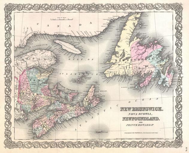 Keywords: 1855 Colton Map of New Brunswick, Nova Scotia, Newfoundland and Price Edward Island - Geographicus - NovaScotia-colton-1855.jpg An excellent first edition example of Colton's rare 1855 map of the Maritime Provinces of New Brunswick Nova Scotia Newfoundland and Prince Edward Island Throughout the map Colton identifies various cities towns forts rivers rapids fords and an assortment of additional topographical details Map is hand colored in pink green yellow and blue pastels to define national and regional boundaries Surrounded by Colton's typical spiral motif border Dated and copyrighted to J H Colton 1855 Published as page no 4 in volume 1 of the first edition of George Washington Colton's 1855 Atlas of the World 1855 dated Size in 16 13 object history credit line accession number NovaScotia-colton-1855 Colton G W <i>Colton's Atlas of the World Illustrating Physical and Political Geography</i> Vol 1 New York 1855 First Edition Geographicus-source PD-old-100 Maps by Joseph Hutchins Colton Old maps of the Gulf of Saint Lawrence Old maps of New Brunswick Old maps of Nova Scotia Old maps of Newfoundland Old maps of Prince Edward Island 1855 maps of Canada |