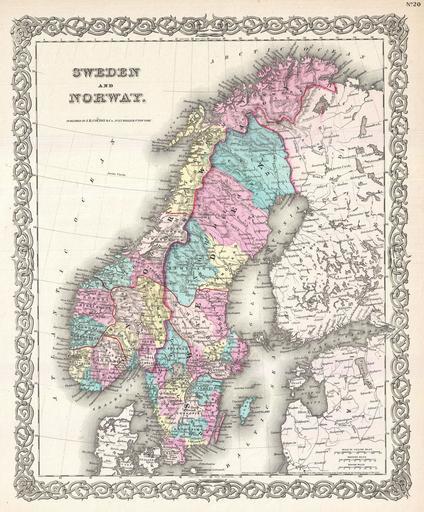 | Keywords: 1855 Colton Map of Scandinavia, Norway, Sweden, Finland - Geographicus - SwedenNorway-colton-1855.jpg A beautiful 1855 first edition example of Colton's map of north eastern Africa Covers from the Arctic Sea south to Denmark and east as far as the Gulf of Finland Includes the modern day nations of Sweden and Norway with part of adjacent Denmark and Finland Throughout Colton identifies various cities towns rivers and assortment of additional topographical details Of particular interest is the legendary Lofoten Maelstrom in northwestern Norway This legendary whirlpool was the inspiration for Edgar Allan Poe's classic tale Descent into the Maelstrom In reality it is a periodic and powerful current caused by tidal variations in the region Surrounded by Colton's typical spiral motif border Dated and copyrighted to J H Colton 1855 Published from Colton's 172 William Street Office in New York City Issued as page no 20 in volume 2 of the first edition of George Washington Colton's 1855 Atlas of the World 1855 dated Size in 13 16 object history credit line accession number SwedenNorway-colton-1855 Colton G W <i>Colton's Atlas of the World Illustrating Physical and Political Geography</i> Vol 2 New York 1855 First Edition Geographicus-source PD-old-100 Maps by Joseph Hutchins Colton Old maps of Scandinavia 1855 maps 1855 in Sweden Topographic maps of Finland |