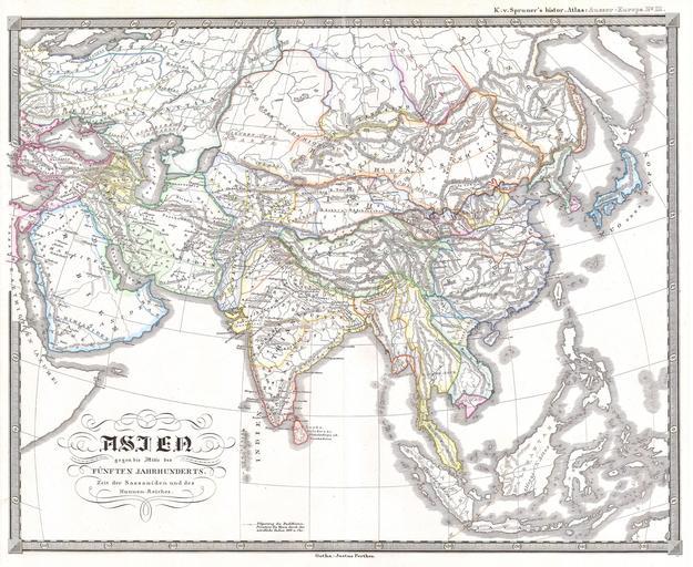 | Keywords: 1855 Spruner Map of Asia in the 5th Century ( Sassanid Empire ) - Geographicus - AsienFunften-spruneri-1855.jpg This fascinating hand colored map depicts Asia at the middle of the 5th century This period corresponds with the period of the great Sassanid Empire and the Song dynasty of China The Sassanid were a Zoroastrian Persian dynasty hailing from modern day Iran All text is in German Map was originally part of the 1855 edition of Karl von Spruner ™s Historical Hand Atlas 1855 Size in 17 14 object history credit line accession number AsienFunften-spruneri-1855 Geographicus-source PD-old-100 Maps showing history of Asia Maps showing 5th-century history Maps of the Sassanid Empire 1855 maps |