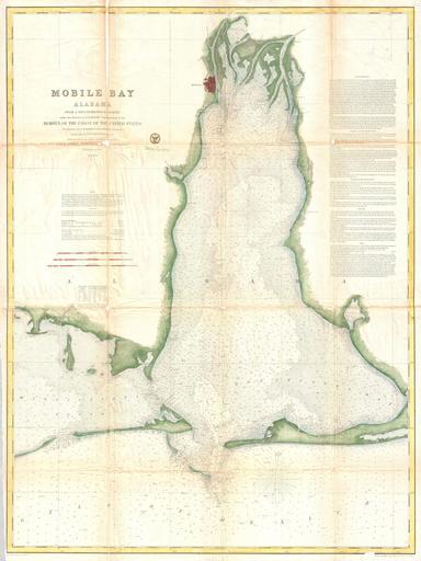 | Keywords: 1856 U.S. Coast Survey Map of Mobile Bay, Alabama - Geographicus - MobileBay-uscs-1856.jpg This is an uncommon 1856 U S Coast Survey Chart or Map of Mobile Bay Alabama Covers from Grand Bay and the mouths of the Alabama and Apalachee Rivers south to Mobile Point Dauphine Island and the Sand Island Bank Also extends westward into the Mississippi Sound to roughly 18 degrees west longitude from Washington D C Includes the city of Moblie Alabama as well as excellent detail of the nearby river delta Countless depth soundings throughout Notes on tides under sea dangers and sailing instructions in the upper right quadrant The Triangulation for this survey was completed by E M Eakin and F H Gerdes The topography is the work of W E Greenwell The Hydrography was accomplished by a party under the command of B F Sands J Alden and C P Patterson The construction of this chart was supervised by A D Bache one of the most important and influential early superintendents of the U S Coast Survey Published in the 1856 edition of the Superintendent's Report 1856 dated Size in 29 38 5 object history credit line accession number MobileBay-uscs-1856 <i>Report of the Superintendant of the U S Coast Survey </i> 1856 edition Geographicus-source PD-art United States Coast Survey maps Old maps of Alabama Old maps of the Gulf of Mexico Mobile Bay 1856 maps |