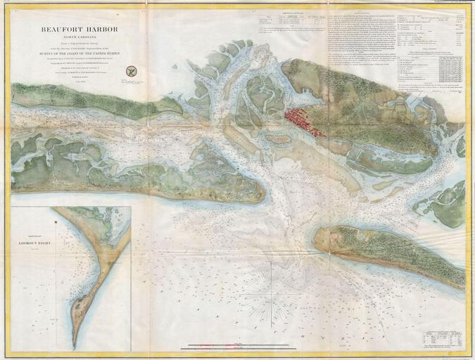 | Keywords: 1857 U.S.C.S. Map of Beaufort Harbor, North Carolina - Geographicus - BeaufortHarbor-uscs-1857.jpg This is a rare and unusual 1857 U S C S Map of Beaufort Harbor North Carolina Depicts the North Carolina coast from Carolina City westward through Beaufort as far as Lenoxville Point Features superb inland detail of the region as well as innumerable depth soundings indications of various shoals and breakers and detailed sailing instructions An inset map in the lower left quadrant shows Lookout Blight or Cape Lookout This map was prepared under the direction of A D Bache for the 1857 edition of the Annual Report of the Coast Survey The triangulation was accomplished by C P Bolles and A S Wadsworth The Topography is the work of H L Whiting and A S Wadsworth The hydrography was assembled by avarious parties under the Command of Lieutenant Commander J N Maffitt and C R P Rodgers 1857 dated Size in 30 22 5 object history credit line accession number BeaufortHarbor-uscs-1857 Geographicus-source PD-art United States Coast Survey maps Old maps of North Carolina 1857 maps Beaufort North Carolina |