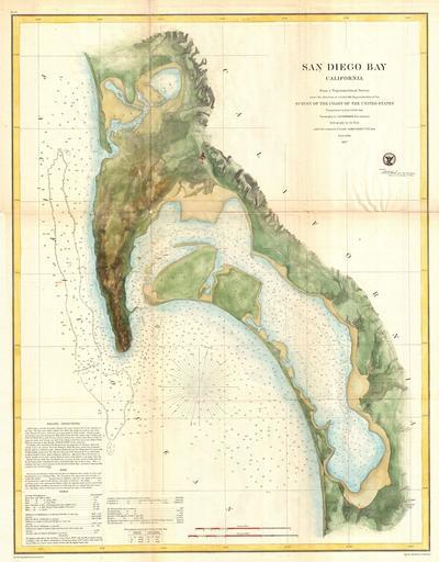| Keywords: 1857 U.S.C.S. Map of San Diego Bay, California - Geographicus - SanDiegoBay-uscs-1857.jpg This is the most attractive map of San Diego Bay California to emerge from the work of the U S Coast Survey Covers the Sand Diego area from False Bay and the Valley of Las Yeguas southward past Mission Valley and San Diego city to San Diego Bay and the villages of La Punta and the Valley of Ohjia Offers superb detail both inland and at sea Inland detail includes topographical features rivers roads and villages Villages and cities including San Diego La Playa New San Diego and others are detailed to the level of individual buildings Nautical details include innumerable depth sounding breakwaters and notes on the Kelp Beds off the coast of Point Lonia Lower left quadrant features textual sailing instructions as well as notes on the tides and a history of the chart This cart was prepared under the supervision of A D Bache for inclusion in the 1857 edition of the Report of the Superintendent of the United States Coast Survey The triangulation for this chart was accomplished by R D Cutts the topography by A M Harrison and the hydrography by a party under the command of James Alden 1857 dated Size in 20 5 27 object history credit line accession number SanDiegoBay-uscs-1857 <i>Report of the Superintendant of the United States Coast Survey </i> Washington 1857 edition Geographicus-source PD-art United States Coast Survey maps San Diego Bay 01 Old maps of California Topographic maps of California History of San Diego California 1857 California in the 1850s 1857 maps Maps of San Diego County California |
