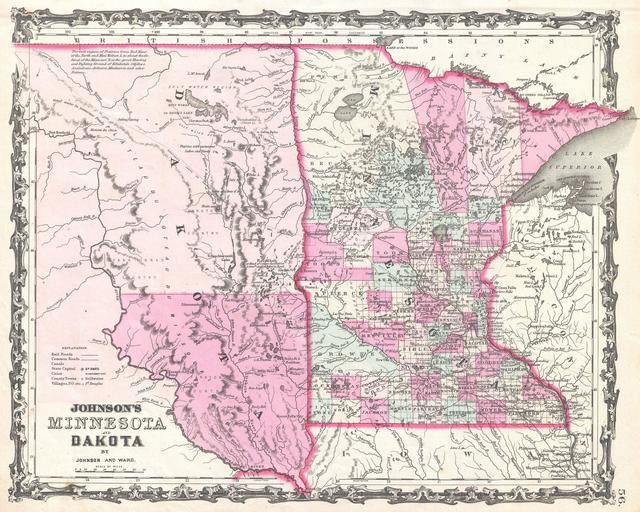 | Keywords: 1862 Johnson Map of Minnesota and Dakota - Geographicus - MNDK-johnson-1862.jpg A beautiful example of A J Johnson ™s 1862 map of Minnesota and Dakota Covers both states as well as adjacent parts of Wisconsin and Iowa This map predates the splitting of the Dakotas and instead depicts them as a single great state bounded on the west by the Missouri River The proposed northern route for the Pacific Railroad runs diagonally in a northwesterly direction across both Minnesota and Dakota Offers color coding according to county and has notations for railways forts roadways cities towns and river systems Also notes several American Indian nations including the Kdakotah Odjibwe Assiniboin Aikara Minitarree and others Features the strapwork style border common to Johnson ™s atlas work from 1860 to 1863 Published by A J Johnson and Ward as plate number 56 in the 1862 edition of Johnson ™s New Illustrated Family Atlas This is the first edition of the Family Atlas to bear the Johnson and Ward imprint 1862 undated Size in 16 12 5 object history credit line accession number s Geographical Statistical and Historical </i> 1862 A J Johnson Ward edition Geographicus-source PD-old-100 Maps by Alvin Jewett Johnson 1862 maps Old maps of North Dakota Old maps of South Dakota Old maps of Minnesota Illustrated Historical Atlas of the State of Iowa |
