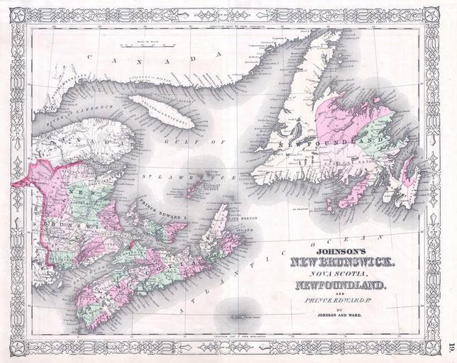 Keywords: 1864 Johnson's Map of New Brunswick, Nova Scotia and Newfoundland (Canada) - Geographicus - NewBrunswick-j-1864.jpg A fine map of the Canadian provinces of New Brunswick Nova Scotia Newfoundland and Prince Edward Island Cartographically this map is based upon the earlier work of J H Colton who himself may have referenced early 19th century British material possibly Wyld ™s 1836 map Page no 19 in the 1864 Johnson and Ward edition of Johnson ™s Family Atlas 1864 Size in 16 5 13 object history credit line accession number NewBrunswick-j-1864 Geographicus-source PD-old-100 Maps by Alvin Jewett Johnson 1864 maps Old maps of Canada |