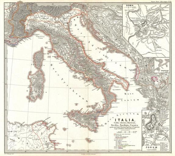 | Keywords: 1865 Spruner Map of Italy after the Battle of Actium - Geographicus - ItaliaGalliaCiterior-spruner-1865.jpg This is Karl von Spruner ™s 1865 map of Italy nearer Gaul Illyria Sicily Sardinia Corsica after the Battle of Actium This detailed map shows the whole of Italy Sicily Corsica and Sardinia Spruner also includes three detailed insets In the top right quadrant depicts Rome with military camps and buildings labeled Directly below that is the city of Brindisi Historically this was an extremely important harbor city due to its position on the Italian peninsula and its natural port on the Adriatic Sea The inset in bottom right quadrant shows the Forum with all major buildings and structures labeled Map shows important cities rivers mountain ranges and other minor topographical detail Countries and territories are designated with colored borders and each map includes a key or legend The whole is rendered in finely engraved detail exhibiting throughout the fine craftsmanship of the Perthes firm 1865 undated Size in 16 13 object history credit line accession number ItaliaGalliaCiterior-spruner-1865 Spruner Karl von <i>Spruner-Menke Atlas Antiquus </i> Gotha Justus Perthes 1865 Geographicus-source PD-old-100 Karl Spruner von Merz Old maps of Italy Maps of ancient Italy |