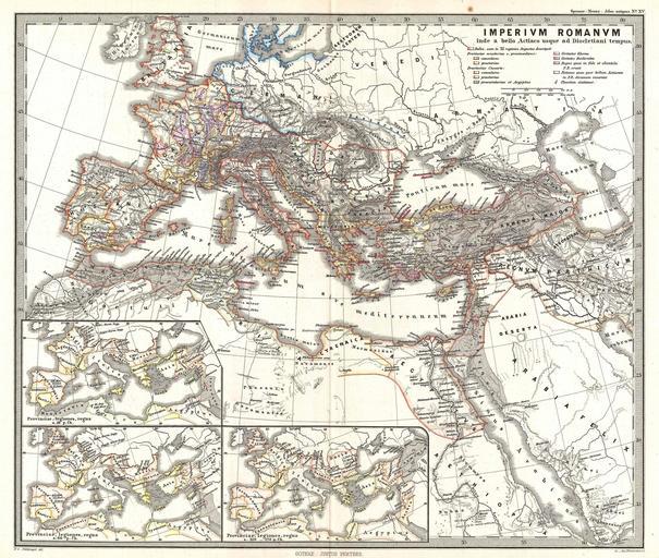 | Keywords: 1865 Spruner Map of the Roman Empire under Diocletian - Geographicus - ImperiumRomanumDiocletian-spruner-1865.jpg A particularly interesting map this is Karl von Spruner ™s 1865 rendering of the Roman Empire under Diocletian 224 “ 311 AD Centered on Italy this map covers the whole of continental Europe extending as far north as Ireland as far east as the Caspian Sea and extending southwards to include Roman holdings in North Africa Egypt and the Middle East Like most of Spruner ™s work this example overlays ancient political geographies on relatively contemporary physical geographies thus identifying the sites of forgotten towns and villages the movements of armies and the disposition of lands in the region This particular example focuses on the tumultuous period prior to the ascendency of the Emperor Diocletian Diocletian presided over a bloated empire verging on decline and to prevent this established the Tetrarchy or rule of four in which the Empire was divided in to four segments under four different emperors This set the stage of the division of the Roman Empire in eastern and western empires under Diocletian ™s heir Christian emperor Constantine Three insets in the lower left quadrant show the disposition of provinces legions and kingdoms at different periods As a whole the map labels important cities rivers mountain ranges and other minor topographical detail Territories and countries outlined in color The whole is rendered in finely engraved detail exhibiting the fine craftsmanship for which the Perthes firm is known Of particular interest to classical scholars 1865 undated Size in 16 13 object history credit line accession number ImperiumRomanumDiocletian-spruner-1865 Spruner Karl von <i>Spruner-Menke Atlas Antiquus </i> Gotha Justus Perthes 1865 Geographicus-source PD-old-100 Karl Spruner von Merz Old maps of the Roman Empire 1865 maps |