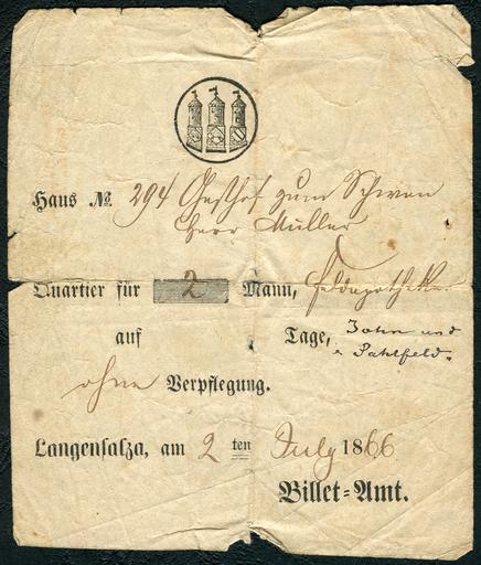 Keywords: 1866-07-02 Billet-Amt Langesalza, Quartier Billet John und Sahlfeld.jpg Wenige Tage nach der Schlacht bei Langensalza von einer noch unidentifizierten Amtsperson handschriftlich ausgefüllter Vordruck eines Einquartierungs-Billets mit dem Wappen der Stadt Langensalza hier ausgefertigt für zwei Soldaten der Königlich Hannoverschen Armee Zitat Haus No 294 Hotel zum Schwan / Herr Müller / Quartier für 2 Mann Feldapotheker / auf Tage / ohne Verpflegung / Langensalza am 2 Juli 1866 / Billet-Amt Die mit anderer Tinte nachträglich geschriebenen Worte John und Friedrich Sahlfeld geben Hinweise auf die Nachnamen der beiden Feldapotheker Scan vom Original Bernd Schwabe 1866-07-02 noch unidentifizierte Amtsperson aus dem Billet-Amt der Stadt Langensalza PD-old Freundeskreis Hannover Battle of Langensalza 1866 Friedrich Sahlfeld 1866 documents Billeting |