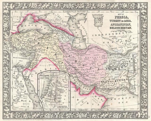 | Keywords: 1866 Mitchell Map of Persia, Turkey and Afghanistan (Iran, Iraq) - Geographicus - PersiaAfghanistan-mitchell-1866.jpg A beautiful example of S A Mitchell Jr ™s 1866 map of Turkey Persia Beloochistan and Afghanistan Covers the modern day nations of Turkey Iran Iraq Syria Jordan and Afghanistan Inset in the lower left quadrant features Palestine or the Holy Land One of the more attractive American atlas maps of this region to appear in the mid 19th century Features the floral border typical of Mitchell maps from the 1860-66 period Prepared by S A Mitchell Jr for inclusion as plate 78 in the 1866 issue of Mitchell ™s New General Atlas Dated and copyrighted Entered according to Act of Congress in the Year 1860 by S Augustus Mitchell Jr in the Clerk ™s Office of the District Court of the U S for the Eastern District of Pennsylvania 1860 dated Size in 13 5 11 object history credit line accession number PersiaAfghanistan-mitchell-1866 Mitchell Jr S A <i>Mitchell's New General Atlas containing Maps of the Various Countries of the World Plans of Cities Etc Embraced in Fifty-five Quarto Maps forming a series of Eighty-Seven Maps and Plans together with Valuable Statistical Tables </i> 1866 Edition Geographicus-source PD-old-100 Maps by Samuel Augustus Mitchell Maps of ancient Persia 1860 maps |