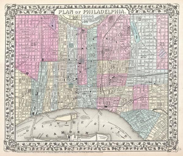 Keywords: 1867 Mitchell Map of Philadelphia, Pennsylvania - Geographicus - Philadelphia-mitchell-1867.jpg A beautiful example of S A Mitchell Jr ™s 1867 map of Philadelphia Pennsylvania Covers Philadelphia focusing on the downtown area between the Schuylkill and Delaware Rivers This is one of the last iterations of Mitchell ™s standard single page map of Philadelphia Subsequent editions reimagined the Mitchell Philadelphia to account for urban expansion to the west of the Schuylkill Names important buildings parks roads railways public work and military installations Color coded according to city wards Surrounded by the attractive vine motif border common to Mitchell atlases between 1866 and 1880 One of the more attractive atlas maps of Philadelphia to appear in the latter half of the 19th century Prepared by S A Mitchell Jr for inclusion as plates 25 in the 1867 issue of Mitchell ™s New General Atlas Dated and copyrighted Entered according to Act of Congress in the Year 1867 by S Augustus Mitchell Jr in the Clerks Office of the District Court for the Eastern District of Pennsylvania 1867 dated Size in 13 5 11 5 object history credit line accession number Philadelphia-mitchell-1867 Mitchell Jr S A <i>Mitchell's new general atlas containing maps of the various countries of the World plans of cities etc </i> 1867 edition Geographicus-source PD-old-100 Maps by Samuel Augustus Mitchell Old maps of Philadelphia 1868 maps |