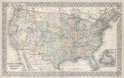 Keywords: 1867 Mitchell Map of the United States - Geographicus - UnitedStates-mitchell-1867.jpg A fine example of Mitchell ™s 1867 map of the United States Depicts the entirety of the continental United States along with parts of Canada and Mexico Shows the country in considerable detail with notations regarding railroads mail routes including the famed Pony Express Route emigrant routes westward topographical and political details Represents the 1867 state of the map in which the western states appear much as they do today with but two notable exceptions Wyoming retains its western panhandle which was later resolved into Montana and Dacotah Dacota is one large state The earlier insets of Norfolk Harbor and Hampton Roads have been replaced with a single inset map of Newfoundland Mitchell would go on to update this map with a new copyright in 1870 when he corrects for Wyoming and in 1872 One of the most attractive American atlas maps of the United States to appear in the mid 19th century Features the floral border typical of Mitchell maps from the 1866-87 period Prepared by W Williams for inclusion as map nos 10 and 11 in the 1867 issue of Mitchell ™s New General Atlas Dated and copyrighted Entered according to Act of Congress in the Year 1867 by S A Mitchell Jr in the Clerk ™s Office of the District Court of the U S for the Eastern District of Pennsylvania 1867 undated Size in 21 5 13 5 object history credit line accession number UnitedStates-mitchell-1867 <i>Mitchell's new general atlas containing maps of the various countries of the World plans of cities etc </i> 1867 edition Geographicus-source PD-old-100 Maps by Samuel Augustus Mitchell Old maps of the United States 1867 maps |