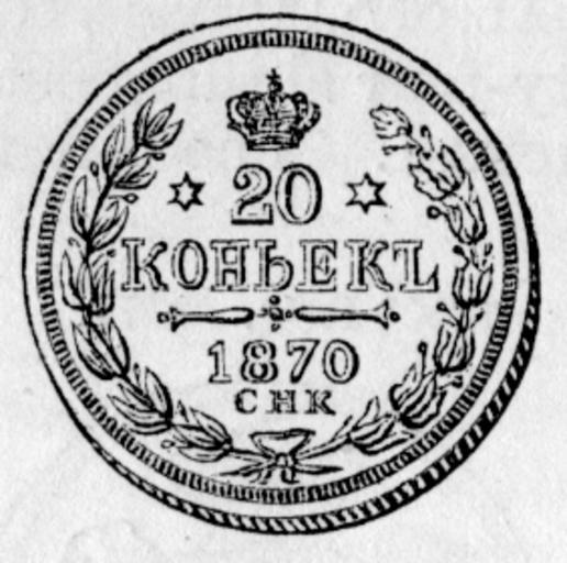 | Keywords: 1870 Russian 20 kopecks obverse.png A Russian silver 20 kopeck piece of 1870 Weight 11 2 fineness 875 Value 57 3/4d Obverse shown Engraving from the article Recent Coinage of the World in the Companion to the British Almanac of 1874 1874 Name of coin designer or engraver not known PD-old Coins of the Russian Empire 1870 coins |