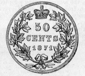 | Keywords: 1871 Canadian 50 cents reverse.png A Canadian fifty-cent piece of 1871 Weight 375 fineness 925 Value nearly 2s Reverse shown Engraving from the article Recent Coinage of the World in the Companion to the British Almanac of 1874 1874 Name of coin designer or engraver not known PD-old Both faces Obverse Coins of Canada 1871 coins 1874 in Canada |