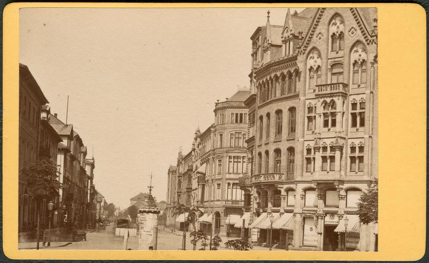 | Keywords: 1877 Blick vom Café Robby (später Kröpcke) und Haus Heinemann in Hannover durch die Georgstraße Richtung Steintor, Bildseite CDV.jpg Blick im Jahr 1877 vom Standort des Café Robby später nach dem Oberkellner Wilhelm Kröpcke in Café Kröpcke umbenannt an der Ecke Bahnhofstraße/Rathenaustraße durch die Georgstraße in Richtung Steintor Die Georgstraße entstand ab 1788 durch die Enfestigung der Altstadt von Hannover und befand sich daher anfänglich in einer Randlage der noch mittelalterlich geprägten Stadt Daher erfolgte die Bebauung - trotz finanzieller Förderung durch die Stadtverwaltung - anfangs nur sehr zögerlich Ein Hinderungsgrund war auch die Auflage an potentielle Bauherren neue Gebäude nur in Massivbauweise zu errichten Erst nach der - zögerlichen- Entscheidung des Königs von Hannover zum Bau des ersten Eisen- Bahnhofs zunächst weit abgelegen auf einem Kartoffelacker in der dann von Georg Ludwig Friedrich Laves angelegten Ernst-August-Stadt Zitat rückte die Georgstraße als Querachse zwischen dem neuen Stadtteil und der alten Stadt in eine Zentrallage Die aus der Perspektive des Café Robby Kröpcke aufgenommene Fotografie von 1877 vermittelt trotz großstädtischer Bebauung noch den Eindruck einer beschaulichen Promenadenallee Das Zitat ist entnomen von Andreas Urban und Ute Ziegan Stadtbilder Hannover 1870 - 1900 dem Katalog zur gleichnamigen Ausstellung im Historischen Museum Hannover das die selbe Fotografie besitzt jedoch mit einem größeren Ausschnitt Etwa an der Stelle der in der Bildmitte erkennbaren Litfaßsäule wurde später die Kröpcke-Uhr aufgestellt Ganz rechts ist das Haus Heinemann zu sehen dahinter das Bahlsen-Haus in dem später Theodor Lessing wohnte Am rechten Bildrand ist der Vorbau des ehemaligen Polytechnikums zu sehen des Vorläuferbaus der heutigen Gottfried Wilhelm Leibniz Universität Hannover Hier brach später - nach der Ausrufung des Deutschen Kaiserreichs und der danach benannten Gründerzeit - der Bauunternehmer Ferdinand Wallbrecht die Karmarschstraße durch die erste durchgängige Querstraße durch Hannover für die Laves zuvor und noch im Königreich Hannover mehrfach vergeblich Pläne seinem König vorgelegt hatte Scan vom Original Bernd Schwabe in Hannover 1877 unidentified photographer 1877 Blick vom Cafe Robby später Kröpcke Richtung Steintor cropped jpg <gallery> File 1877 Blick vom Café Robby später Kröpcke und Haus Heinemann in Hannover durch die Georgstraße Richtung Steintor Rückseite CDV jpg Rückseite mit der Angabe ca 1880 </gallery> PD-old 1877 in Hannover Haus Heinemann Hannover Advertising columns in Hannover Kröpcke-Uhr Bahlsen-Haus Hannover Kröpcke-Center Hannover Rathenaustraße Hannover |