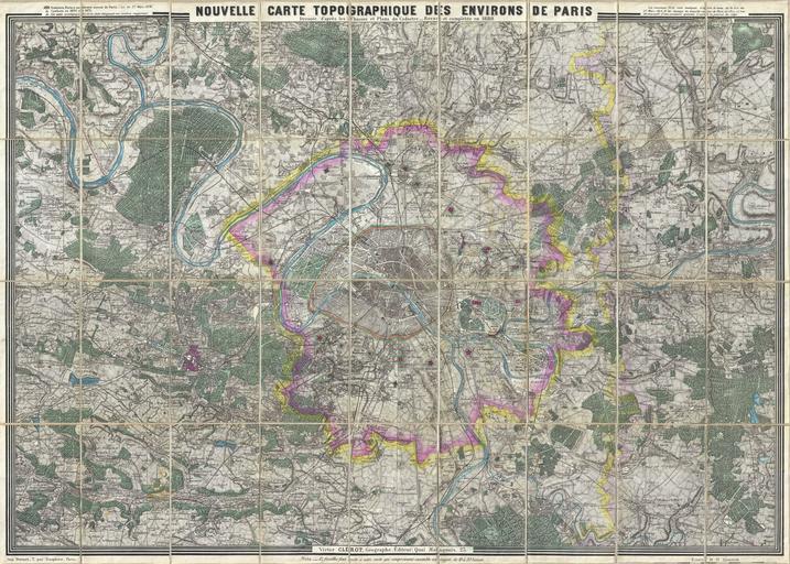 Keywords: 1880 Clerot Pocket Map of Paris and Environs, France - Geographicus - Paris-clerot-1880.jpg Issued in 1880 by Victor Clerot this is one of the largest and most strikingly beautiful 19th century folding maps of Paris we have ever encountered Details the greater Paris vicinity from the Bois de Marechaux in the southwest Evesquemont in the northwest La Grange in the southeast and Les Tillieres near Dammartin in the northeast Map offers extraordinary detail throughout showing forests fields buildings gardens estates temples farms rivers roadways trains and topographical features Gardens forests the Seine and the official boundaries of Paris and beautifully colored in green pink and blue pastels The fortifications surrounding Paris built following the Franco-Prussian War and the brief Paris Commune period 1870s are particularly highlighted This map was issued in case or pocket format dissected into 36 sections and laid on linen for easy folding 1880 dated Size in 39 5 28 object history credit line accession number Paris-clerot-1880 Geographicus-source PD-100 Maps of Paris in the 19th century 1880 19th-century maps of Paris 1880 1880 maps Paris 1880 in Paris Map |