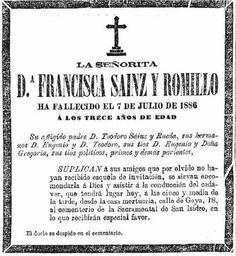 Keywords: 1886-07-08-Francisca-Sainz-Romillo-esquela.jpg Esquela de Francisca Sainz y Romillo fallecida el 7 de julio de 1886 a los trece años de edad Su afligido padre D Teodoro Sainz y Rueda sus hermanos D Eugenio y D Teodoro sus tios D Eugenio y Doña Gregoria sus tios politicos primos y demas parientes suplican a sus amigos que por olvido no hayan recibido esquela de invitacion se sirvan encomendarla a Dios y asistir a la conduccion del cadaver que tendrà lugar hoy a las cinco y media de la tarde desde la casa mortuoria calle de Goya 18 al cementerio de la Sacramental de San Isidro en lo que recibiran especial favor El duelo se despide en el cementerio 1886-07-08 El Imparcial Madrid 8 7 1886 pag 4 El Imparcial other versions PD-old Uploaded with UploadWizard 1886 obituaries in Spain Teodoro Sainz Rueda Obituary El Imparcial obituaries ImageNote 1 30 121 500 463 569 617 2 Esquela de Francisca Sainz y Romillo fallecida el 7 de julio de 1886 a los trece años de edad Su afligido padre D Teodoro Sainz y Rueda sus hermanos D Eugenio y D Teodoro sus tios D Eugenio y Doña Gregoria sus tios politicos primos y demas parientes suplican a sus amigos que por olvido no hayan recibido esquela de invitacion se sirvan encomendarla a Dios y asistir a la conduccion del cadaver que tendrà lugar hoy a las cinco y media de la tarde desde la casa mortuoria calle de Goya 18 al cementerio de la Sacramental de San Isidro en lo que recibiran especial favor El duelo se despide en el cementerio ImageNoteEnd 1 |