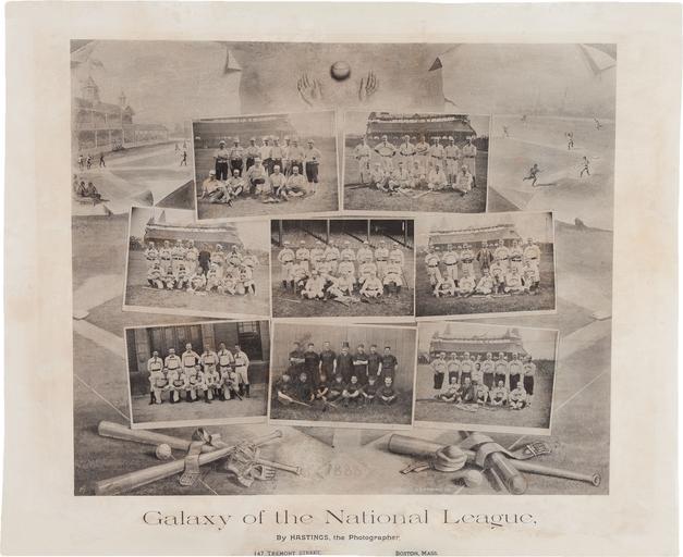 Keywords: 1888 Galaxy of the National League.jpg 1888 Galaxy of the National League Lithograph by G H Hastings Rare nineteenth century features a photo montage of eight National League baseball teams Washington Nationals Pittsburgh Alleghenys New York Giants Boston Beaneaters Indianapolis Hoosiers Chicago White Stockings Philadelphia Phillies and Detroit Wolverines Hall of Famers that are depicted include Cap Anson Sam Thompson Deacon White Harry Wright Mickey Welch Jim O'Rourke Montgomery Ward Buck Ewing Tim Keefe Roger Connor and Pud Galvin http //sports ha com/itm/baseball/1888-galaxy-of-the-national-league-lithograph-by-gh-hastings/a/7123-81898 s Heritage Auctions 1888 G H Hastings 147 Tremont Street Boston Mass PD-old 1888 Chicago White Stockings season Washington Nationals 1886 “89 New York Giants baseball Boston Braves Philadelphia Phillies Detroit Wolverines |