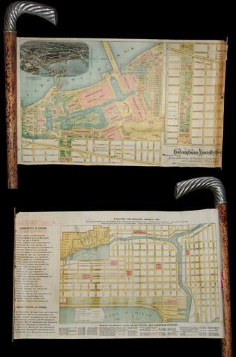 | Keywords: 1893 Novelty Cane Map of the Chicago World's Fair or Columbian Exposition - Geographicus - ChicagoWorldsFair-columbiannovelty-1893.jpg An extremely rare and unusual cane and map prepared in 1893 for the Chicago World's Fair or as it is better known the 1893 Columbian Exposition The map extends from an internal roller mechanism in the top of the cane It is printed and hand colored on both sides The primary side shows the grounds of the Columbian Exposition now Jackson Park and the Field Museum naming all important buildings walks pavilions markets etc Among the specific sites noted are Buffalo Bill's Wild West Show Congress of Rough Riders the Chicago University Grounds and the various pavilions established for manufacturing mining transportation liberal arts agriculture machinery etc In the upper left quadrant there is a aerial view of the entire fair A larger inset along the right hand side of the map focuses on the Midway from Stony Island to Cottage Grove The 1893 Columbian Exposition or Chicago World's Fair was a pivotal moment in the history of the United States Chicago won the right to host the World's Fair over New York Washington D C and St Louis During its six month run nearly 27 000 000 people roughly half the population of the United States at the time attended the fair Its numerous displays and exhibits established conventions for architecture design and decorative arts in addition to initiating a new era of American industrial optimism The layout and design of the fair as seen here is the world of Daniel Burnham and Frederick Law Olmsted the genius behind New York City's Central Park Most of the fair was designed in the Beaux Arts tradition a popular movement in Paris that was quickly gaining global momentum In the years following the fair this influential architectural style redefined the cityscape of Chicago Boston New York and many other prominent American cities Printed by August Gast of St Louis for the Columbian Novelty Company of Chicago Originally sold in the gift shops of the 1893 Columbian Exposition 1893 undated Size in 16 10 object history credit line accession number ChicagoWorldsFair-columbiannovelty-1893 Geographicus-source PD-art World's Columbian Exposition Old maps of Chicago Canes |