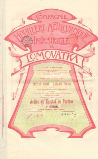 Keywords: 1899. Companie Hovillere & Industrielle de Lomovatka, Акция в 100 франков.jpg Комания угольных шахт и п омышленных п едп иятий Ломоватки Companie Hovillere Industrielle de Lomovatka Акция в 100 ф анков 1899 г http //infodon org ua/postal/281 1899 author PD-RusEmpire Stock certificates from Luhansk Oblast Files uploaded by Andrew Butko from various sources 19th century Images from infodon org ua
