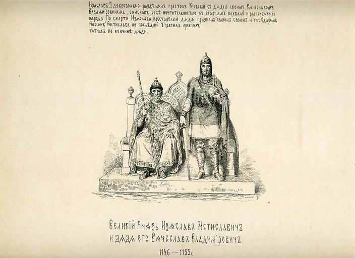 | Keywords: 18 History of the Russian state in the image of its sovereign rulers.jpg ru Великий Князь Изяслав стиславич и дядя его Вячеслав Владими ович 1146-1155 г <br>Изяслав II доб овольно азделил п естол Киевский с дядею своим Вячеславом Владими овичем снискав себе почтительностью к ста шему похвалу и асположение на ода По сме ти Изяслава п еста елый дядя п изнал сыном своим и госуда ем Россиян Ростислава но последний ут атил п естол тотчас по кончине дяди full 18 History of the Russian state in the image of its sovereign rulers - fragment jpg Iziaslav II of Kiev Vyacheslav of Kiev |
