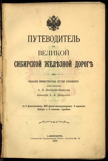 Keywords: Путеводитель по Великой Сибирской железной дороге; Под редакцией А.И.Дмитриева-Мамонова и инженера А.Ф.Здзярского. - Санкт-Петербург : Издание Министерства Путей Сообщения, 1900 Товарищество Художественной Печати. - 606 с., иллюстрации, 7 л. карт, портреты ; 23 см