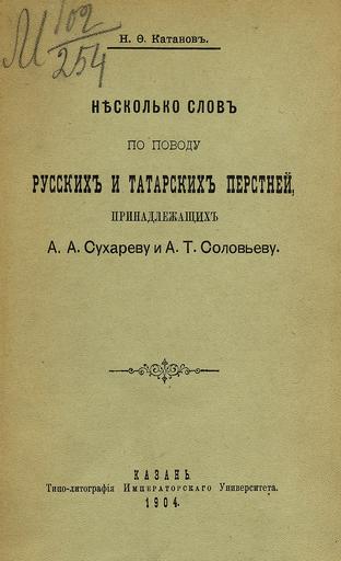 ... Несколько слов по поводу русских и татарских перстней, принадлежащих А.А. Сухареву и А.Т. Соловьеву / Н.Ф. Катанов. - Казань : типо-лит. Имп. ун-та, 1904. - 20 с. : ил.; 24.