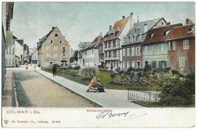 Keywords: 19050212 colmar schwarzburgplatz.jpg fr Vue de Colmar au début du XXe siècle carte postale 1905-02-12 dated by the sender of the postcard and by the postmark COLMAR 13 2 05 9-10V Vintage postcards private collection author other versions 48 4 25 N 7 21 22 6 E region FR_heading NE PD-old-70-1923 Place des Six-Montagnes-Noires Colmar Postcards of Colmar Haut-Rhin in the 1900s Postcards uploaded by user Jean Housen Uploaded with UploadWizard Historical images of Colmar Grand'Rue Colmar Fontaine Roesselmann Koifhus |