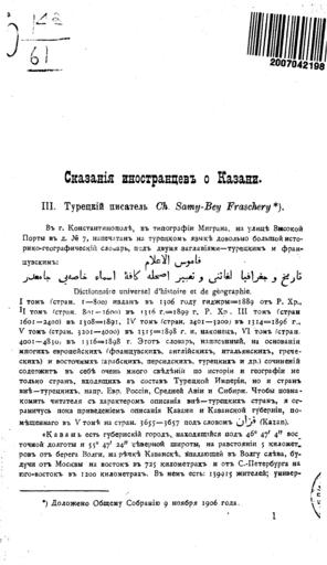 | Keywords: Турецкий писатель Ch. Samy-Bey Fraschery : Доложено Общ. собранию 9 ноября 1906 г. - 1906. - 6 с.