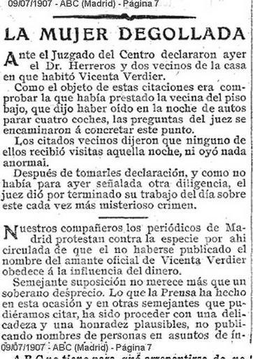 | Keywords: 1907-07-09-ABC-stampa-sotto-accusa.jpg es LA MUJER DEGOLLADA Ante el Juzgado del Centro declararon ayer el Dr Herreros y dos vecinos de la casa en que abitò Vicenta Verdier Como el objeto de estas citaciones era comprobar la que habia prestado la vecina del piso bajo que dijo de haber oido en la noche de autos parar cuatro coches las preguntas del juez se encaminaron à concretar este punto Los citados vecinos dijeron que ninguno de ellos recibiò visitas aquella noche ni oyò nada anormal Despues de tomarles declaracion y como no habia para ayer señalada otra diligencia el juez diò por terminado su trabajo del dia sobre este cada vez mà s misterioso crimen - - - - Nuestros compañeros los periodicos de Madrid protestan contra la especie por ahi circulada de que el no haberse publicado el nombre del amante oficial de Vicenta Verdier obedece à la influencia del dinero Semejante suposicion no merece mà s que un soberano desprecio Lo que la Prensa ha hecho en esta ocasion y en otras semejantes que pudieramos citar ha sido proceder con una delicadeza y una honradez plausibles no publicando nombres de personas en asuntos de indagines it Articolo del quotidiano ABC di Madrid del 7 9 1907 riferentesi al crimen de la calle de los Tudescos in cui si la stampa si difende dalla falsa accusa di aver taciuto per denaro il nome dell'amante di Vicenta Verdier la vittima morta sgozzata LA DONNA SGOZZATA Davanti al tribunale del Centro deposero ieri il Dott Herreros e due vicini della casa in cui abitò Vicenta Verdier Le domande del giudice istruttore erano finalizzate a verificare le affermazioni della vicina del piano di sotto che aveva dichiarato che la notte del delitto aveva sentito fermarsi quattro automobili sotto casa I citati vicini dissero che nessuno di loro ricevette visite quella notte e neppure avvertirono qualcosa di anormale Dopo aver preso queste deposizioni non avendo nessun'altra segnalazione da verificare per ieri il giudice ritenne concluso il suo lavoro del giorno su questo delitto sempre più misterioso - - - - - - - - I nostri compagni dei giornali di Madrid protestano contro la voce qui circolata che il fatto di non aver pubblicato subito il nome dell ™amante ufficiale di Vicenta Verdier fosse imputabile all ™influenza del denaro Simili supposizioni non meritano altro che un sovrano disprezzo Quello che la stampa ha fatto in questa occasione e in altre simili che potremmo citare è stato di procedere con una delicatezza e una onorabilità comprensibili non pubblicando nomi di persone durante le indagini preliminari 1907-07-09 own Albertomos PD-old ABC Madrid El crimen de la calle de los Tudescos Madrid Uploaded with UploadWizard ImageNote 1 1 16 455 620 457 647 2 LA MUJER DEGOLLADA Ante el Juzgado del Centro declararon ayer el Dr Herreros y dos vecinos de la casa en que abitò Vicenta Verdier Como el objeto de estas citaciones era comprobar la que habia prestado la vecina del piso bajo que dijo de haber oido en la noche de autos parar cuatro coches las preguntas del juez se encaminaron à concretar este punto Los citados vecinos dijeron que ninguno de ellos recibiò visitas aquella noche ni oyò nada anormal Despues de tomarles declaracion y como no habia para ayer señalada otra diligencia el juez diò por terminado su trabajo del dia sobre este cada vez mà s misterioso crimen - - - - Nuestros compañeros los periodicos de Madrid protestan contra la especie por ahi circulada de que el no haberse publicado el nombre del amante oficial de Vicenta Verdier obedece à la influencia del dinero Semejante suposicion no merece mà s que un soberano desprecio Lo que la Prensa ha hecho en esta ocasion y en otras semejantes que pudieramos citar ha sido proceder con una delicadeza y una honradez plausibles no publicando nombres de personas en asuntos de indagines ImageNoteEnd 1 |