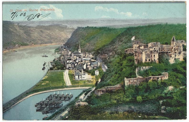 | Keywords: 19080107 st goar ruine rheinfels.jpg fr Vue de Sankt Goarshausen au début du XXe siècle carte postale 1908-01-07 dated by the sender of the postcard and by the postmark STRASSBURG -7 1 08 7-8N Vintage postcards private collection author other versions PD-old-70-1923 Uploaded with UploadWizard Sankt Goarshausen Burg Katz Ships on the Rhine Postcards of Germany Vereinigte Kunstdruckereien Metz Lautz Darmstadt 07 VII 001741 Germany in the 1900s Postcards uploaded by user Jean Housen | ||||