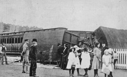 Keywords: blackandwhite monochrome outdoor black and white Derailment of a mixed train while entering Latrobe station platform. J Hellewell photo 26th May 1910 Railway Accident A LATROBE SENSATION. TRUCKS LEAVE THE RAILS Yesterday the afternoon train from Burnie to Launceston arrived in due course within three hundred yards of the Latrobe station. It was composed of an engine, three box trucks, two passenger carriages and a guard's van. On passing the points the middle truck left the rails and bumped along to the cattle pit, on the north side of the street, crossing which it ran into a gate used for pedestrians, which it smashed, and else ripped up twenty yards of fencing, when twenty yards from the station it turned on its side, on the right hand. This caused the truck in front to fall right across the line. the third truck smashed into it, and was thrown to the left, the buffer of the following carriage being forced right through it. Not more than half an hour's delay was caused, as the line is a double one just here. The carriage was unhooked and shun ted, and the train sent off to Launceston. Mr. James Ramsay, who was a passenger to Latrobe, was much surprised at the wreck caused, as his experience was not sufficiently bad in the carriage to account for it. Constable Montgomery, who saw the train after it turned the curve, was amazed at the antics cut by the de¬railed truck as it smashed into the cattle pit and crossed the street. Constable Meers and Mr. Eric Lowe, who were both at the station at the time, said it seemed as though the train was going to smash up station and all, and a general stampede took place. In consequence of the double track but little delay was caused to the evening train to Burnie. The plant for clearing the line will arrive at Latrobe in time to repair the damage before noon to-day. Derailment of a mixed train while entering Latrobe station platform. J Hellewell photo 26th May 1910 Railway Accident A LATROBE SENSATION. TRUCKS LEAVE THE RAILS Yesterday the afternoon train from Burnie to Launceston arrived in due course within three hundred yards of the Latrobe station. It was composed of an engine, three box trucks, two passenger carriages and a guard's van. On passing the points the middle truck left the rails and bumped along to the cattle pit, on the north side of the street, crossing which it ran into a gate used for pedestrians, which it smashed, and else ripped up twenty yards of fencing, when twenty yards from the station it turned on its side, on the right hand. This caused the truck in front to fall right across the line. the third truck smashed into it, and was thrown to the left, the buffer of the following carriage being forced right through it. Not more than half an hour's delay was caused, as the line is a double one just here. The carriage was unhooked and shun ted, and the train sent off to Launceston. Mr. James Ramsay, who was a passenger to Latrobe, was much surprised at the wreck caused, as his experience was not sufficiently bad in the carriage to account for it. Constable Montgomery, who saw the train after it turned the curve, was amazed at the antics cut by the de¬railed truck as it smashed into the cattle pit and crossed the street. Constable Meers and Mr. Eric Lowe, who were both at the station at the time, said it seemed as though the train was going to smash up station and all, and a general stampede took place. In consequence of the double track but little delay was caused to the evening train to Burnie. The plant for clearing the line will arrive at Latrobe in time to repair the damage before noon to-day. |