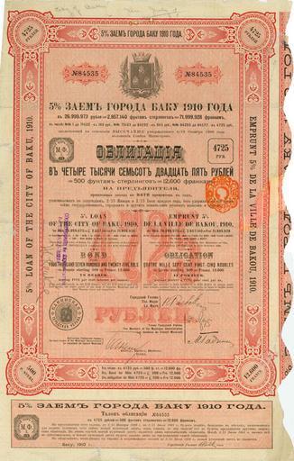 Keywords: Заем г. Баку, 1910.jpg ru аименование City of Baku / Ville de Bakou аименование Русский Заем г Баку Ст ана Russland Aserbaidschan Описание Baku 1910 5 Obligation über 4 725 Rubel £ 500 12 600 Francs 84535 44 4 x 28 5 cm rot schwarz britischer Steuerstempel Knickfalte quer Randeinrisse und Fehlstück professionell restauriert Drumm/Henseler SUT 2005c R10 Auflage nur 285 Stück Absolute Rarität Описание Русский Баку 1910 5 облигация в 4 725 уб £ 500 12 600 ф анков 84535 44 4 x 28 5 см к асный че ный б итанская печать ге бового сбо а складка попе ек аз ывы по к аям и ото ванный ф агмент п офессионально от естав и ованы в каталоге Д умм/Хензеле SUT 2005c R10 Выпуск состоял всего из 285 облигаций Абсолютная едкость 1910 Taken from http //www hwph de/akzii-obligazii/losnr-auktnr-pa17-844_ru html this site City of Baku Custom license marker 2014 03 26 PD-old-100 Uploaded with UploadWizard 1910 in Baku |