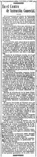 | Keywords: 1910-Centro-Instruccion-Comercial-conferencia.jpg es Centro de Instruccion Comercial - Conferencia inaugural del vicepresidente del Centro capitan de Infanteria D Ricardo Fernandez de Tamarit con intervencion final del presidente de dicho Centro D Eugenio Sainz Romillo 1910-05-11 La Correspondencia militar 11 5 1910 pag 2 author other versions La Correspondencia militar 11 5 1910 pag 2 En el Centro de Instruccion Comercial El vicepresidente del Centro de Instruccion Comercial ilustrado capitan de Infanteria D Ricardo Fernandez de Tamarit diò en el salon de actos de dicho Centro la conferencia inaugural del curso que ha de desarrollar en el mismo relativo a El comercio su historia è importancia Las excepionales dotes que adornan a tan brillante y estudioso oficial no necesitan de nuestro sincero y cariñoso aplauso para ser reconocidas y alabadas; el capitan Tamarit por su amor al trabajo por su laudable aplicacion por su vasta cultura por su elocuencia ha merecido y merece nuestra admiracion entusiasta Y esto sucede a cuantos tienen la suerte de escuchar aun en la conversacion particular su verbo focoso el fino gracejo de su ingenio No lejano de sus legitimos intereses; no es extraño por consiguente que a oirle acudiesen la inmensa mayoria de los socios de aquel Centro y que llevasen con ellos a sus familias Despues de un brillante exordio en el que exquematizò su proposito en aquella y en sucesivas conferencias formulando el plan en que ha de sujetarse hizo el analisis del comercio su origen y principios con citas abundantes y comparativas en las que recordò a Hoff ¦ Duesberzg Gilbart; Chevalier Seneuil Clement etc Refutò las doctrinas de Gilbart demostrandonos que el comercio necesita un Ejercito fuerte y bien atendido y que los gastos de los presupuestos de Guerra son reproductivos Las naciones comerciales asegura fueron las mas guerreras De Corinto ciudad comercial por excelencia salieron mas generales de prestigio que de las otras ciudades griegas Añadiò que el ejercito debe ser el hermano predilecto de todas clases socales y que muchos de los que se llaman antimilistaristas dejaron de serlo si de cerca se estudiasen y conocieran sus virtudes En una breve excursion a traves de la historia de Tyro Grecia Roma Cartago è Inglaterra demonstrò que a la prosperidad del poderio militar ha correspondido siempre un intenso desarollo comercial Estudiò la importancia de la clase comercial y su influencia en las naciones que debe inspirarse en un asiduo trabajo cultura y ardiente patriotismo Y terminò su brillante conferencia analizando el concepto de Patria en parrafos vibrantes calurosamente aplaudidos EEl capitan Fernandez de Tamarit tuvo por principal objeto en su discurso hacer notar la importancia de las instituciones armadas destuyendo el erroneo concepto tan arraigado en las clases comerciales de que cuanto el Estado gasta en Ejercito y Marina se emplearia mejor en otras cosas porque en caso de peligro cada uno defiende lo suyo El esfuerzo del capitan Tamarit abogando por el engrandecimiento del Ejercito ante un publico ajeno al brazo armado de la Patria es de un merito extraordinario Hablar a convencidos es batallar sin enemigo; lo loable lo plausible lo meritorio es conseguir la victoria despertando en el elemento civil y muy especialmente en el comercial el cariño al Ejercito la fe en su progreso y la seguridad de su triunfo Tal fue la labor del capitan Tamarit; labor el digna de los mas digna de imitacion; labor para el pueblo Las sucesivas conferencias seran tambien importantisimas; la proxima versarà sobre El comerio en el pueblo egipcio El salon estaba lleno; al lado del conferenciante tomaron asiento el profesorado del Centro y las señoras Al terminar su peroracion el capitan Tamarit el presidente Eugenio Sainz Romillo dijo que aunque no era costumbre de la Junta hablara el lo hacia para hacer resaltar la importancia merito y elevacion de los conceptos expuestos en la conferencia y añadiò una oportunisima indicacion que seguramente los oyentes apreciarian en su justo valor PD-old Uploaded with UploadWizard Centro de Instruccion Comercial Madrid La Correspondencia militar Madrid 1910 in Madrid Ricardo Fernandez de Tamarit |