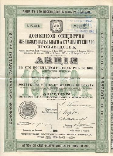 View Original:1911. Донецкое общество железоделательного и сталелитейного производства. Акция в 187 рублей 50 копеек.jpg (1275x1755)