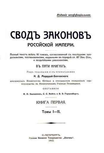 Keywords: Свод законов (1912).jpg ru Свод законов Российской импе ии Полный текст всех 16 томов согласованный с последними п одолжениями постановлениями изданными в по ядке ст 87 Зак Осн и позднейшими узаконениями Книга пе вая 1912 http //rusantico ru/images/cms/data/mg_6462 jpg rusantico ru И Д о духай-Болтовский П Балканов С С Войт В Э Ге ценбе г other versions Custom license marker 2015 01 24 PD-Russia Law of the Russian Empire |