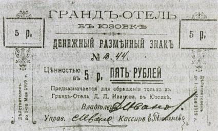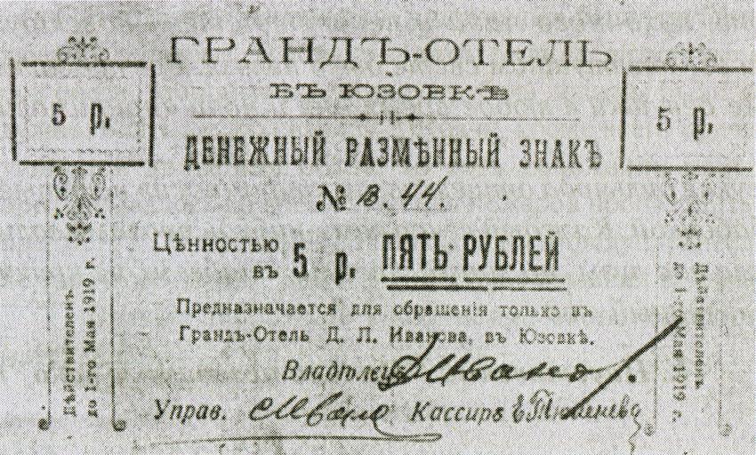 | View Original: | 1913. Денежный разменный знак Гранд-отеля в Юзовке.jpg (2727x1643) | |||